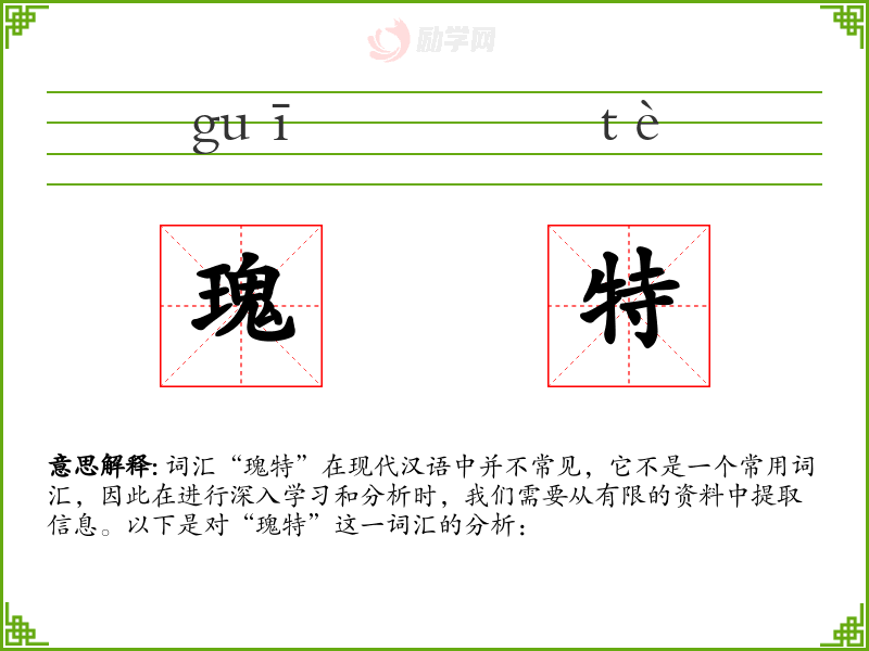 词汇“瑰特”在现代汉语中并不常见,它不是一个常用词汇,因此在进行深入学*和分析时,我们需要从有限的资料中提取信息。以下是对“瑰特”这一词汇的分析: