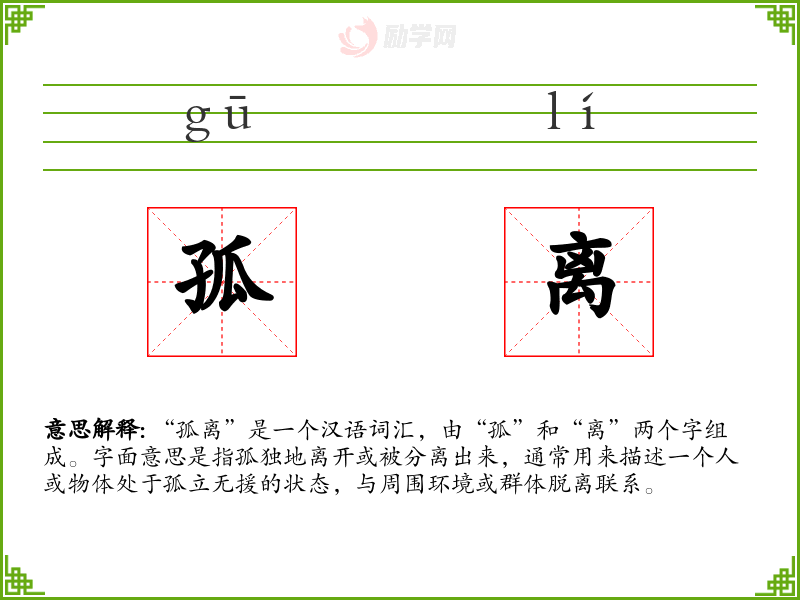 “孤离”是一个汉语词汇,由“孤”和“离”两个字组成。字面意思是指孤独地离开或被分离出来,通常用来描述一个人或物体处于孤立无援的状态,与周围环境或群体脱离联系。