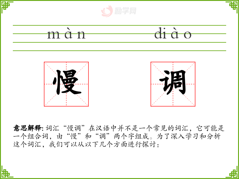 词汇“慢调”在汉语中并不是一个常见的词汇,它可能是一个组合词,由“慢”和“调”两个字组成。为了深入学*和分析这个词汇,我们可以从以下几个方面进行探讨: