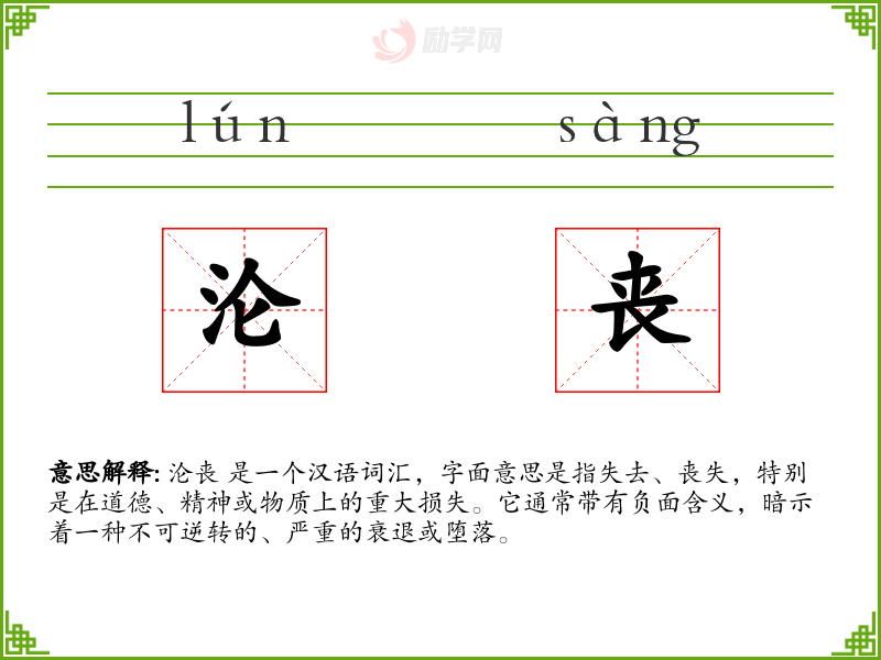 - 文学:在文学作品中,“沦丧”常用来描述人物的道德堕落或社会的衰败,如“道德沦丧”、“文化沦丧”。
