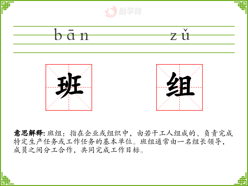 - 口语:在日常口语中,班组一词可能不常单独使用,但人们会谈论“班组工作”、“班组管理”等话题。
