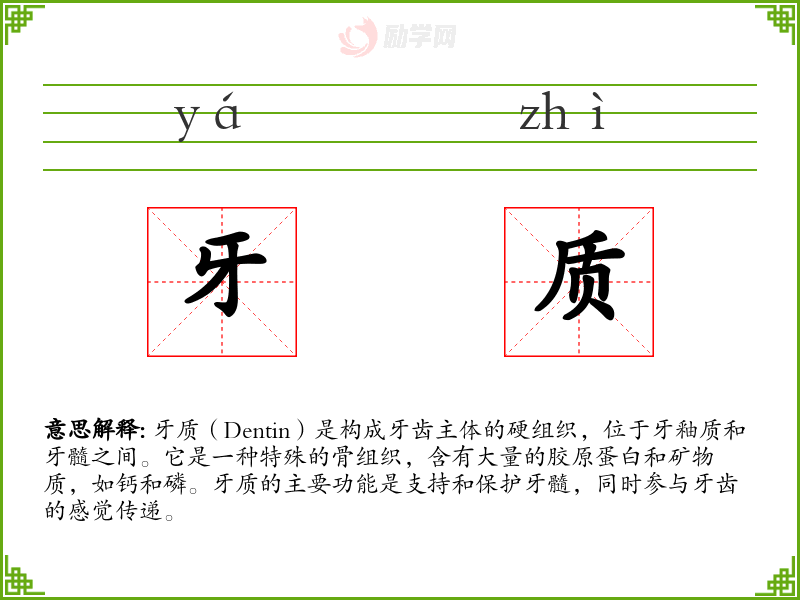 牙质的意思是:属性词。以象牙为质料的:~的刀把儿。