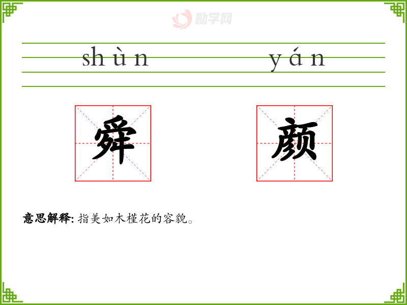 舜颜的意思是:指美如木槿花的容貌。