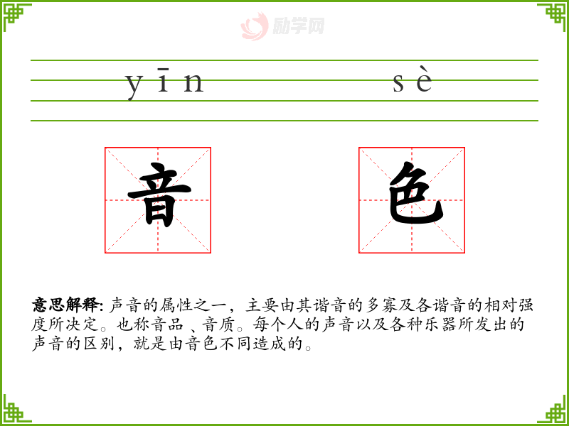音色的意思是:声音的属性之一,主要由其谐音的多寡及各谐音的相对强度所决定。也称音品﹑音质。每个人的声音以及各种乐器所发出的声音的区别,就是由音色不同造成的。