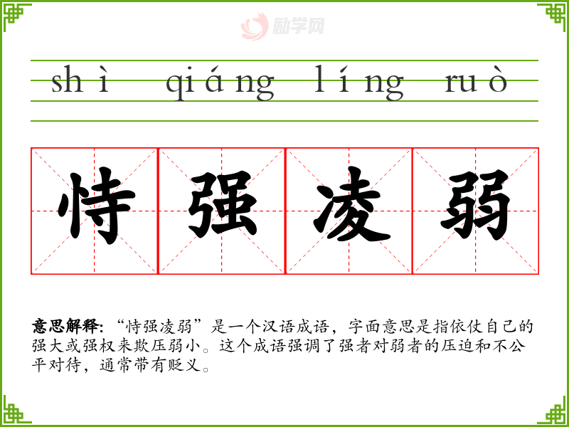 “恃强凌弱”是一个汉语成语,字面意思是指依仗自己的强大或强权来欺压弱小。这个成语强调了强者对弱者的压迫和不公平对待,通常带有贬义。
