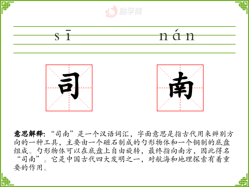 司南的意思是:我国古代辨别方向用的一种仪器。用天然磁铁矿石琢成一个杓形的东西,放在一个光滑的盘上,盘上刻着方位,利用磁铁指南的作用,可以辨别方向,是现在所用指南针的始祖; 比喻行事的准则;正确的指导; 司南车的省称; 犹司晨。