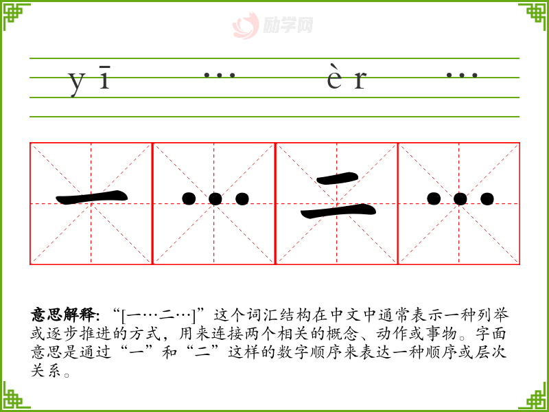 “[一…二…]”这个词汇结构在中文中通常表示一种列举或逐步推进的方式,用来连接两个相关的概念、动作或事物。字面意思是通过“一”和“二”这样的数字顺序来表达一种顺序或层次关系。