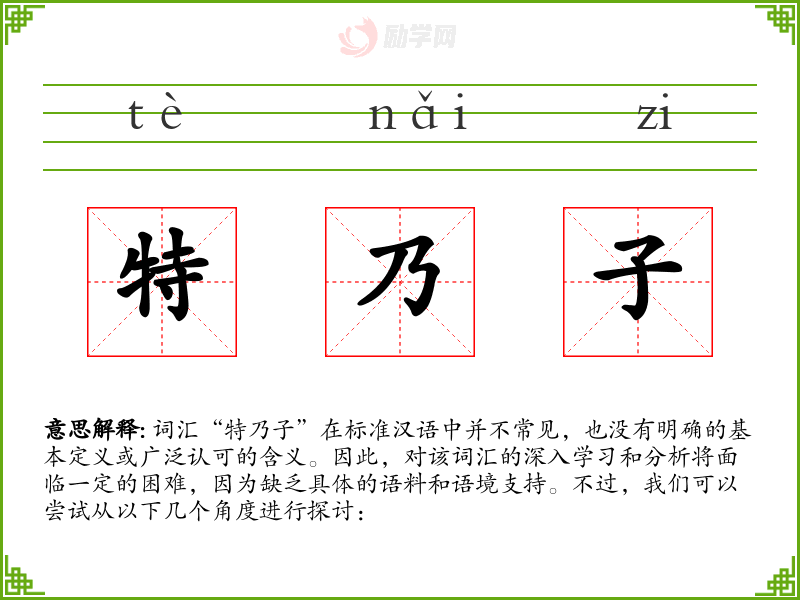 由于“特乃子”不是一个标准汉语词汇,我们无法对其进行深入的分析和总结。在语言学习和表达中,我们应关注那些有明确定义和广泛认可的词汇,以确保沟通的准确性和有效性。