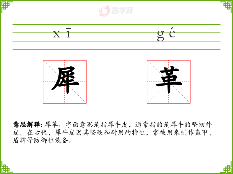 - 古代战士的盔甲,多用犀革制成,坚不可摧。