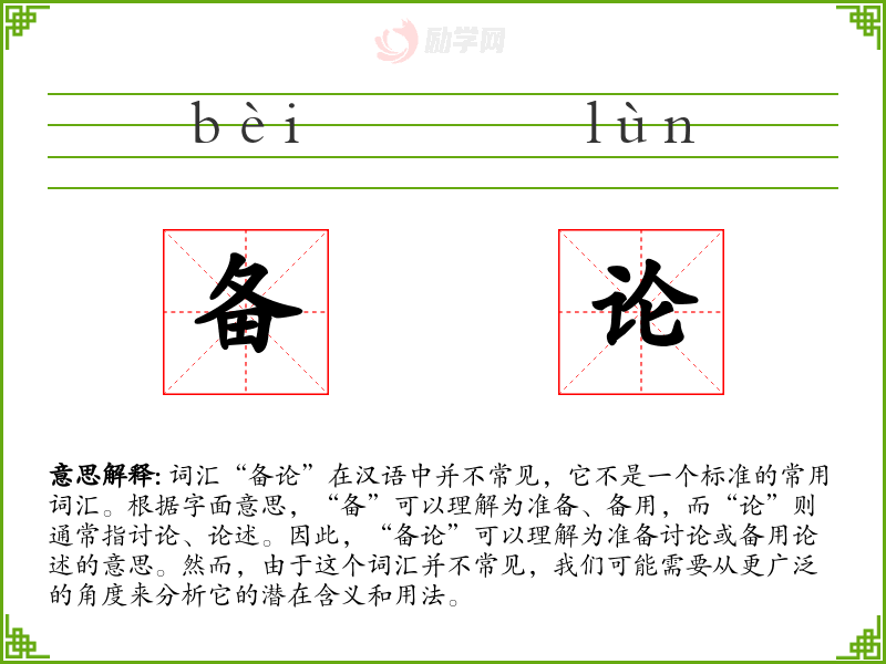 词汇“备论”在汉语中并不常见,它不是一个标准的常用词汇。根据字面意思,“备”可以理解为准备、备用,而“论”则通常指讨论、论述。因此,“备论”可以理解为准备讨论或备用论述的意思。然而,由于这个词汇并不常见,我们可能需要从更广泛的角度来分析它的潜在含义和用法。