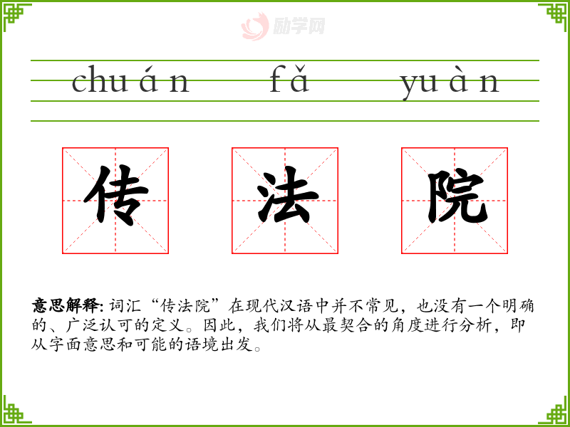 词汇“传法院”在现代汉语中并不常见,也没有一个明确的、广泛认可的定义。因此,我们将从最契合的角度进行分析,即从字面意思和可能的语境出发。