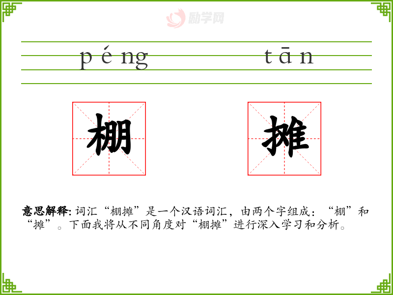 词汇“棚摊”是一个汉语词汇,由两个字组成:“棚”和“摊”。下面我将从不同角度对“棚摊”进行深入学*和分析。