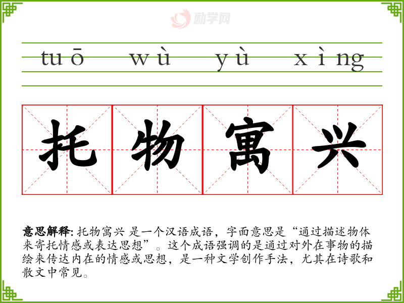 托物寓兴 是一个汉语成语,字面意思是“通过描述物体来寄托情感或表达思想”。这个成语强调的是通过对外在事物的描绘来传达内在的情感或思想,是一种文学创作手法,尤其在诗歌和散文中常见。