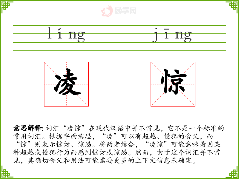 词汇“凌惊”在现代汉语中并不常见,它不是一个标准的常用词汇。根据字面意思,“凌”可以有超越、侵犯的含义,而“惊”则表示惊讶、惊恐。将两者结合,“凌惊”可能意味着因某种超越或侵犯行为而感到惊讶或惊恐。然而,由于这个词汇并不常见,其确切含义和用法可能需要更多的上下文信息来确定。
