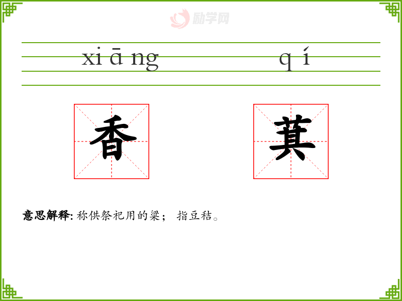 香萁的意思是:称供祭祀用的粱; 指豆秸。