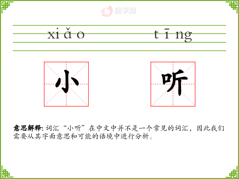 词汇“小听”在中文中并不是一个常见的词汇,因此我们需要从其字面意思和可能的语境中进行分析。