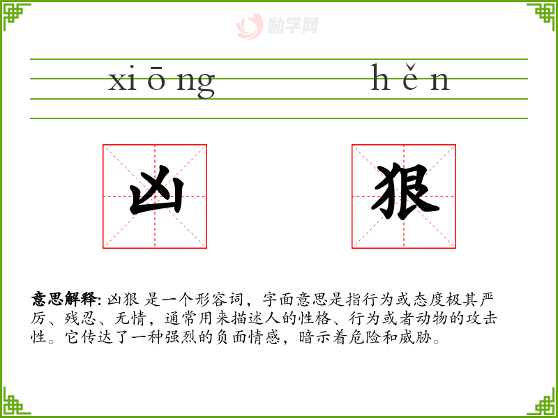 凶狠 是一个形容词,字面意思是指行为或态度极其严厉、残忍、无情,通常用来描述人的性格、行为或者动物的攻击性。它传达了一种强烈的负面情感,暗示着危险和威胁。