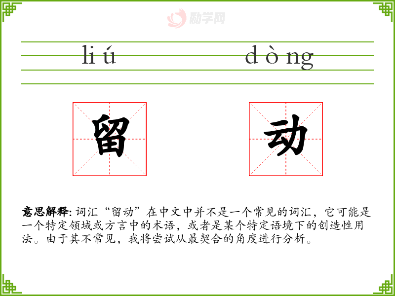 词汇“留动”在中文中并不是一个常见的词汇,它可能是一个特定领域或方言中的术语,或者是某个特定语境下的创造性用法。由于其不常见,我将尝试从最契合的角度进行分析。
