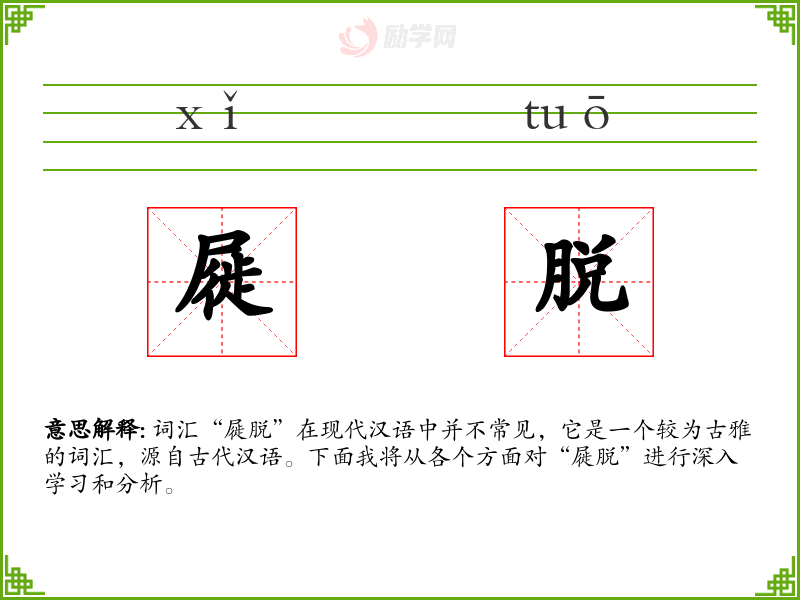词汇“屣脱”在现代汉语中并不常见,它是一个较为古雅的词汇,源自古代汉语。下面我将从各个方面对“屣脱”进行深入学习和分析。