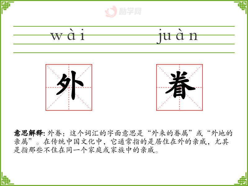 外眷:这个词汇的字面意思是“外来的眷属”或“外地的亲属”。在传统**文化中,它通常指的是居住在外的亲戚,尤其是指那些不住在同一个家庭或家族中的亲戚。