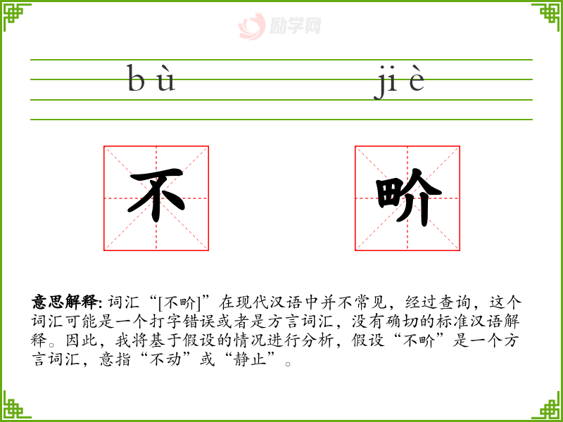 词汇“[不畍]”在现代汉语中并不常见,经过查询,这个词汇可能是一个打字错误或者是方言词汇,没有确切的标准汉语解释。因此,我将基于假设的情况进行分析,假设“不畍”是一个方言词汇,意指“不动”或“静止”。