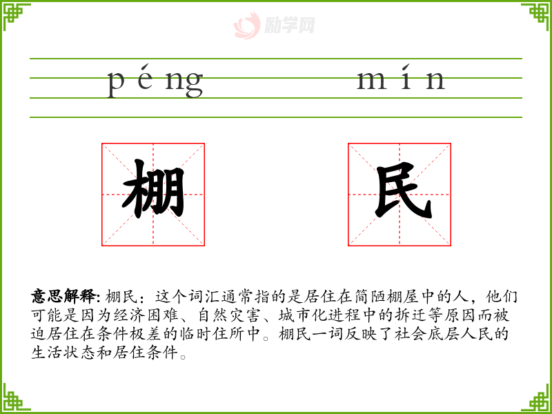 棚民:这个词汇通常指的是居住在简陋棚屋中的人,他们可能是因为经济困难、自然灾害、城市化进程中的拆迁等原因而被迫居住在条件极差的临时住所中。棚民一词反映了社会底层人民的生活状态和居住条件。