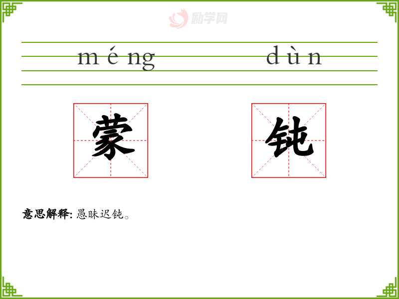 钝[ dùn ] 1. (形声。从金,屯声。本义:不锋利)。 2. 同本义。 【引证】 《文选·檄吴将校部曲》-兵不钝锋。 诸葛亮《出师表》-庶竭驽钝。 【组词】 钝刀 [更多解释]