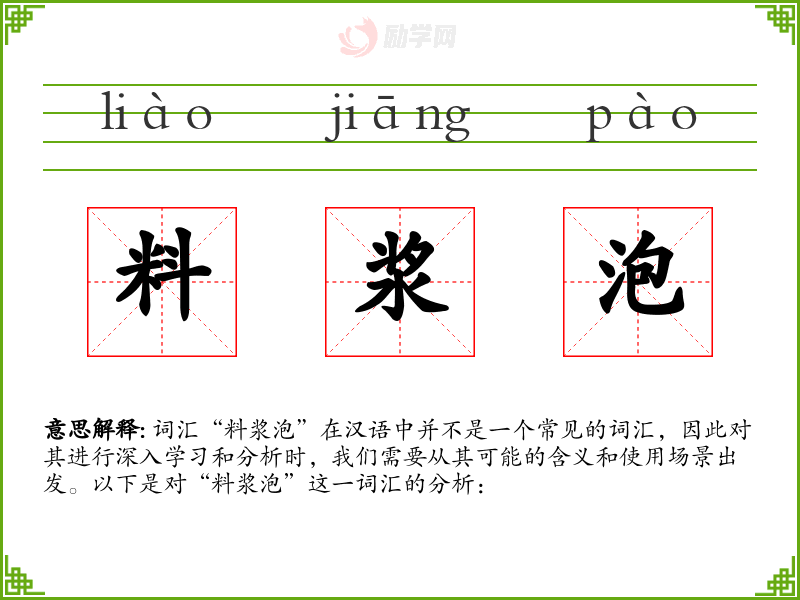 词汇“料浆泡”在汉语中并不是一个常见的词汇,因此对其进行深入学习和分析时,我们需要从其可能的含义和使用场景出发。以下是对“料浆泡”这一词汇的分析: