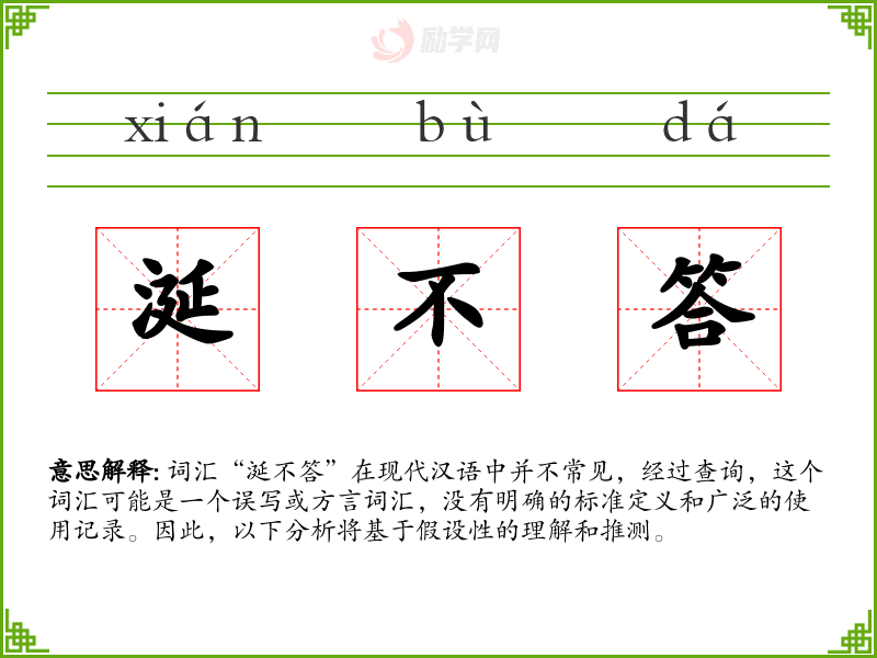 词汇“涎不答”在现代汉语中并不常见,经过查询,这个词汇可能是一个误写或方言词汇,没有明确的标准定义和广泛的使用记录。因此,以下分析将基于假设性的理解和推测。