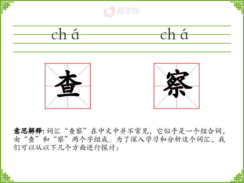 词汇“查察”在中文中并不常见,它似乎是一个组合词,由“查”和“察”两个字组成。为了深入学习和分析这个词汇,我们可以从以下几个方面进行探讨: