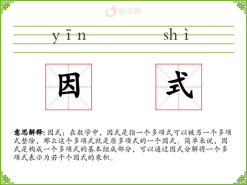 因式作为数学中的一个基本概念,对于理解和解决数学问题至关重要。它不仅是数学技能的一部分,也是逻辑思维和分析能力的重要体现。在语言学习和表达中,理解和正确使用因式这个词汇,有助于深化对数学概念的理解和应用。