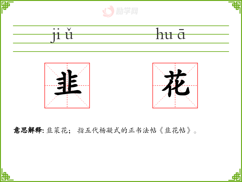 韭花的意思是:韭菜花; 指五代杨凝式的正书法帖《韭花帖》。