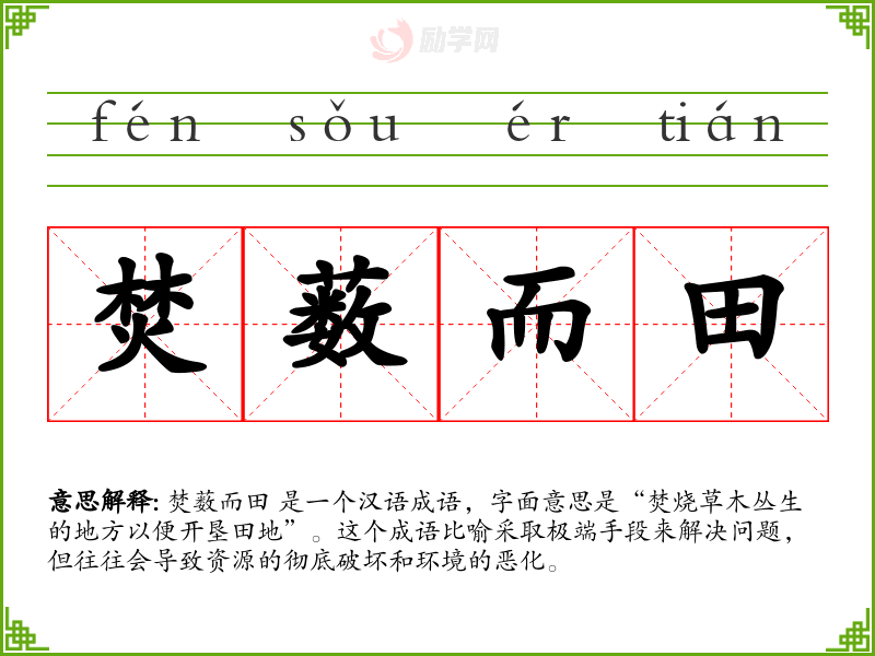 - 细微差别:这些词汇强调的是在发展过程中保护环境和资源的平衡,与焚薮而田 形成鲜明对比。