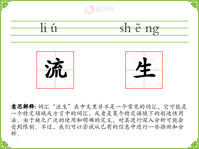 词汇“流生”在中文里并不是一个常见的词汇,它可能是一个特定领域或方言中的词汇,或者是某个特定语境下的创造性用法。由于缺乏广泛的使用和明确的定义,对其进行深入分析可能会受到限制。不过,我们可以尝试从已有的信息中进行一些推测和分析。