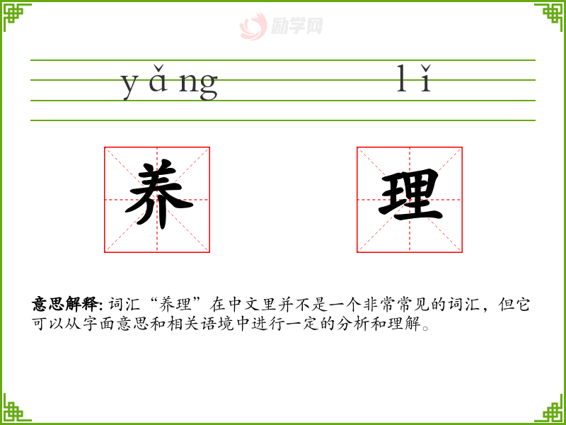 词汇“养理”在中文里并不是一个非常常见的词汇,但它可以从字面意思和相关语境中进行一定的分析和理解。
