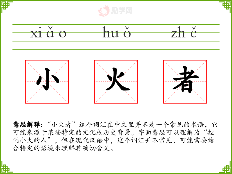 “小火者”这个词汇在中文里并不是一个常见的术语,它可能来源于某些特定的文化或历史背景。字面意思可以理解为“控制小火的人”,但在现代汉语中,这个词汇并不常见,可能需要结合特定的语境来理解其确切含义。
