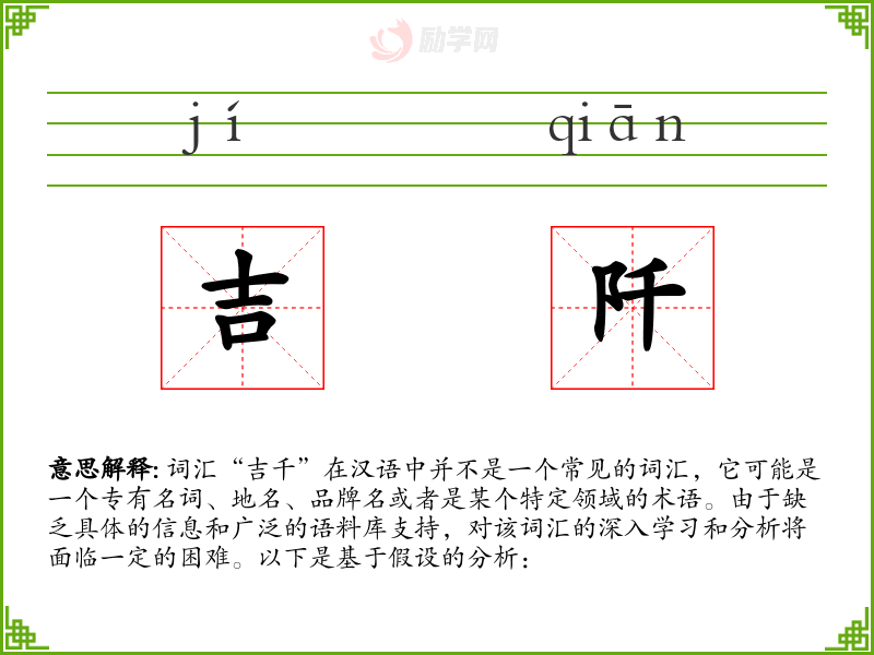 词汇“吉千”在汉语中并不是一个常见的词汇,它可能是一个专有名词、地名、品牌名或者是某个特定领域的术语。由于缺乏具体的信息和广泛的语料库支持,对该词汇的深入学习和分析将面临一定的困难。以下是基于假设的分析: