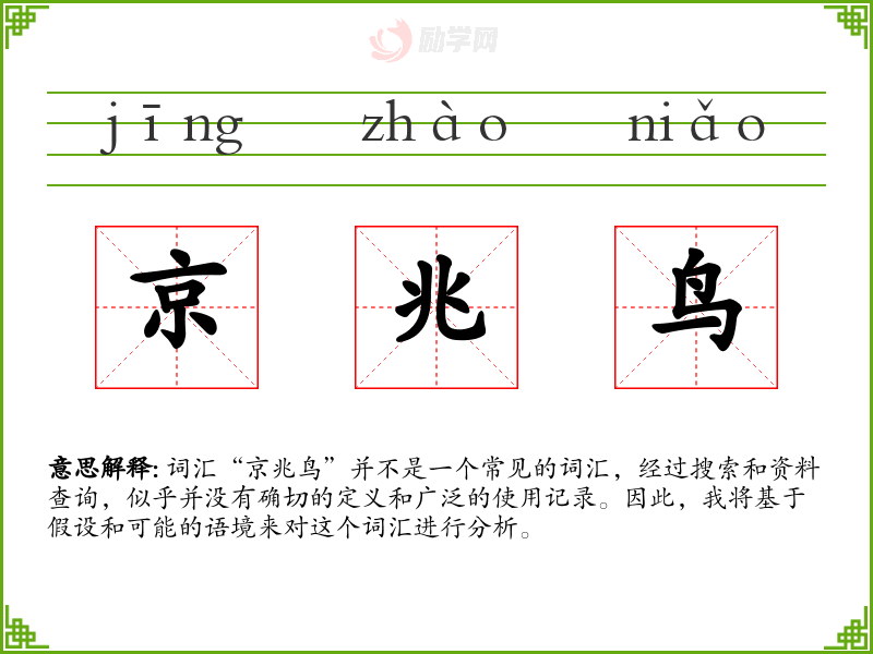 词汇“京兆鸟”并不是一个常见的词汇,经过搜索和资料查询,似乎并没有确切的定义和广泛的使用记录。因此,我将基于假设和可能的语境来对这个词汇进行分析。