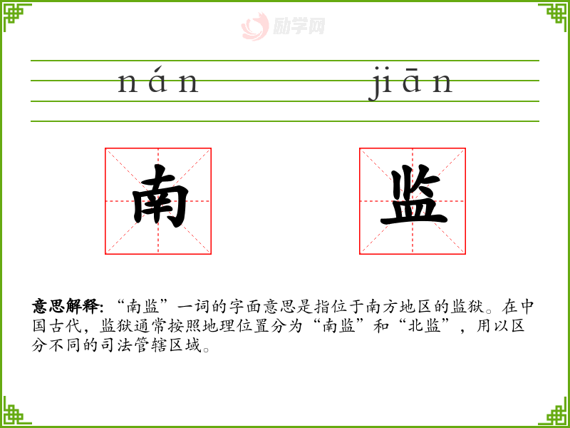 “南监”一词的字面意思是指位于南方地区的监狱。在**古代,监狱通常按照地理位置分为“南监”和“北监”,用以区分不同的司法管辖区域。