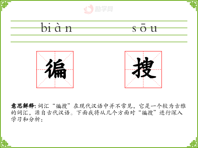 词汇“徧搜”在现代汉语中并不常见,它是一个较为古雅的词汇,源自古代汉语。下面我将从几个方面对“徧搜”进行深入学习和分析:
