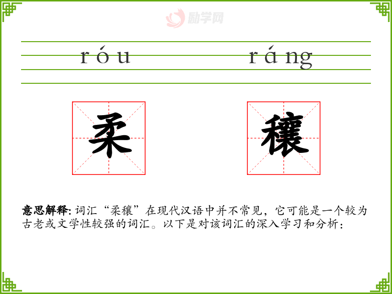 词汇“柔穰”在现代汉语中并不常见,它可能是一个较为古老或文学性较强的词汇。以下是对该词汇的深入学*和分析: