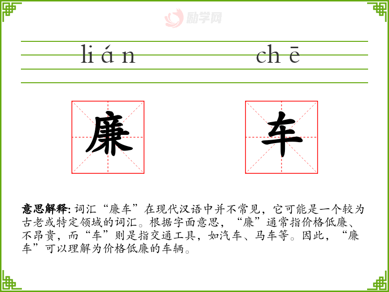词汇“廉车”在现代汉语中并不常见,它可能是一个较为古老或特定领域的词汇。根据字面意思,“廉”通常指价格低廉、不昂贵,而“车”则是指交通工具,如汽车、马车等。因此,“廉车”可以理解为价格低廉的车辆。
