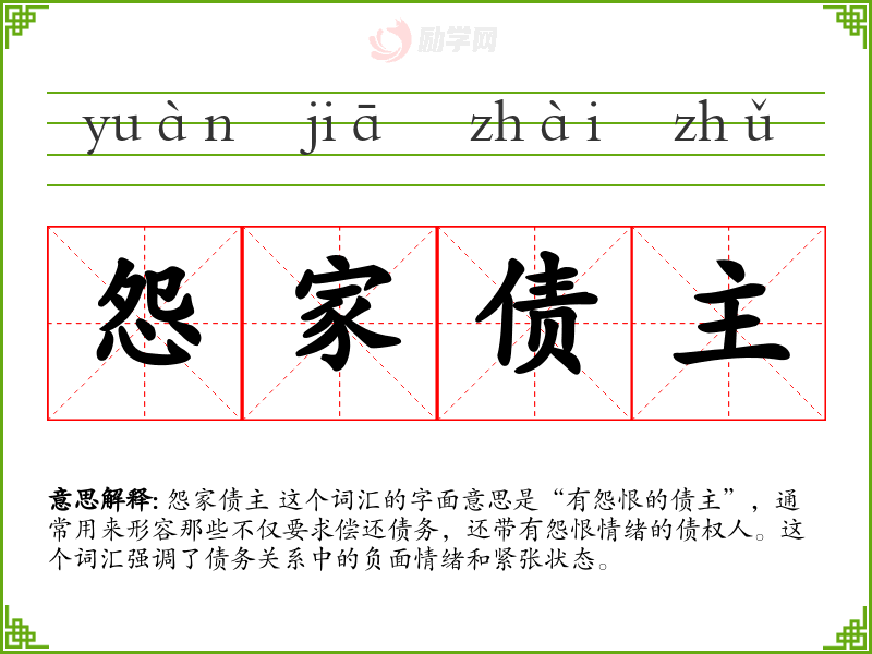 怨家债主 这个词汇的字面意思是“有怨恨的债主”,通常用来形容那些不仅要求偿还债务,还带有怨恨情绪的债权人。这个词汇强调了债务关系中的负面情绪和紧张状态。