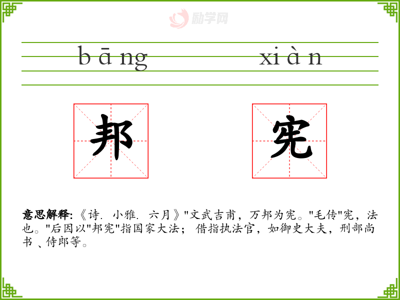 邦宪的意思是:《诗.小雅.六月》"文武吉甫,万邦为宪。"毛传"宪,法也。"后因以"邦宪"指国家大法; 借指执法官,如御史大夫,刑部尚书﹑侍郎等。