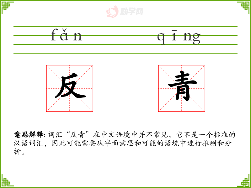 由于“反青”不是一个常用词汇,它在不同语境下的使用可能非常有限。在某些特定的社会或文化背景下,它可能被用来指代反对年轻人或年轻文化的态度或行为。