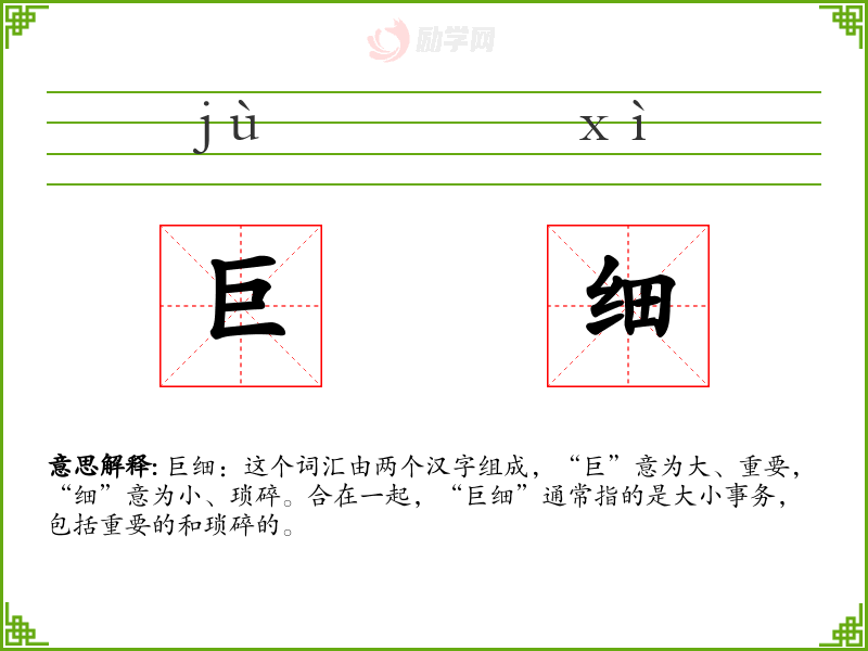 巨细:这个词汇由两个汉字组成,“巨”意为大、重要,“细”意为小、琐碎。合在一起,“巨细”通常指的是大小事务,包括重要的和琐碎的。