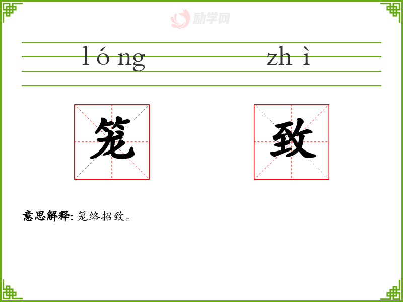 汉·贾谊《过秦论》-致天下之士。 《史记·魏公子列传》-致食客三千人。(致,招致,招徕。) 《三国志·诸葛亮传》-不可屈致。 《三国演义》-今宜厚待刘禅,以致孙休。 清·袁枚《祭妹文》-致孤危托落。(致,招致,造成。) 《明史》-致此疾困。