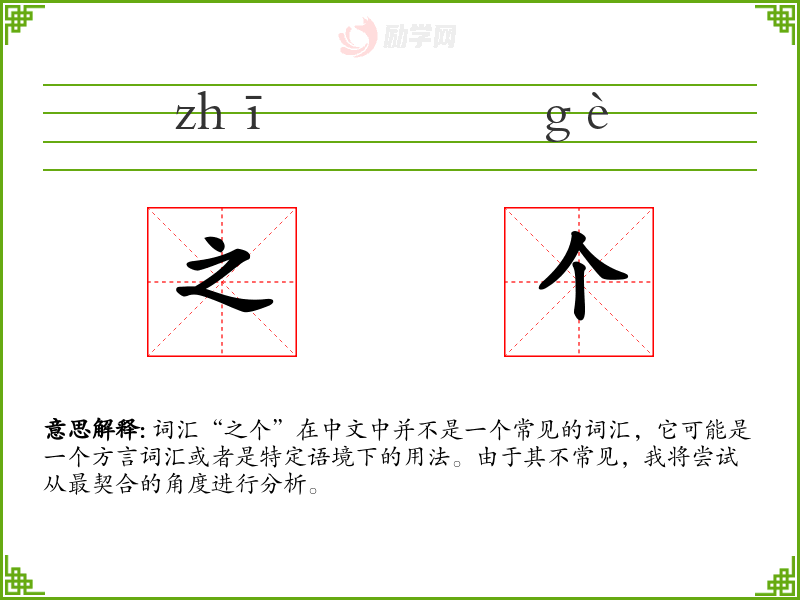 “之个”在普通话中并不常见,它可能是某些方言中的词汇。在普通话中,“之”通常用作代词或连词,而“个”是量词,用于计量事物。如果“之个”作为一个词汇存在,它可能是在特定方言中用来指代某个事物或情况。