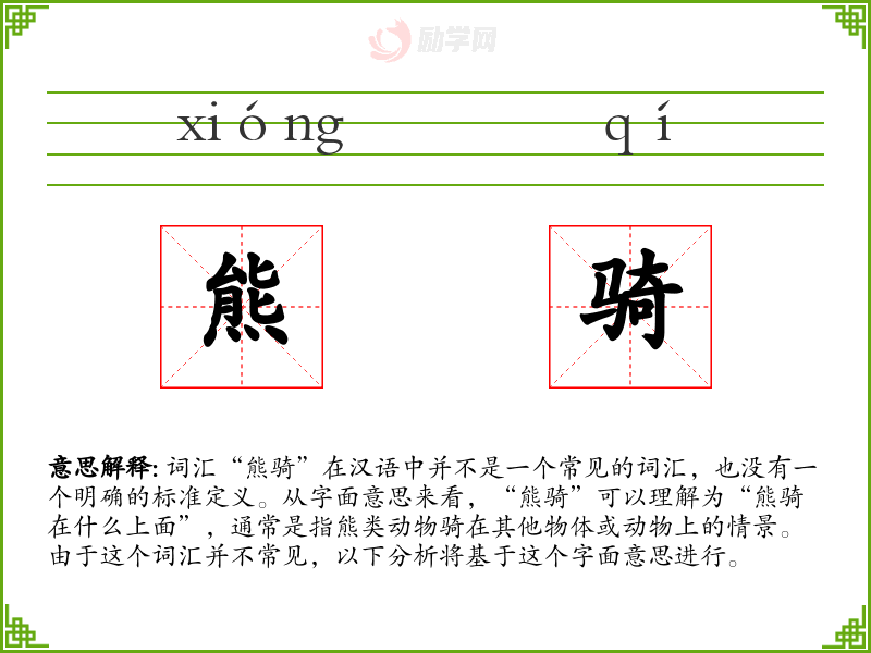 由于“熊骑”不是一个常用词汇,它在不同语境下的使用非常有限。可能在一些特定的文学作品、儿童故事或幽默场合中出现,用以描述一种夸张或不寻常的情景。