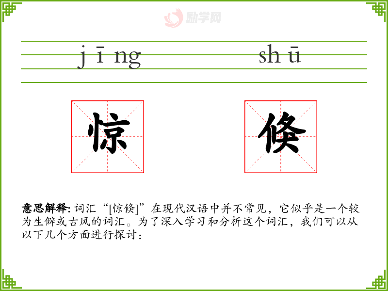 词汇“[惊倏]”在现代汉语中并不常见,它似乎是一个较为生僻或古风的词汇。为了深入学*和分析这个词汇,我们可以从以下几个方面进行探讨: